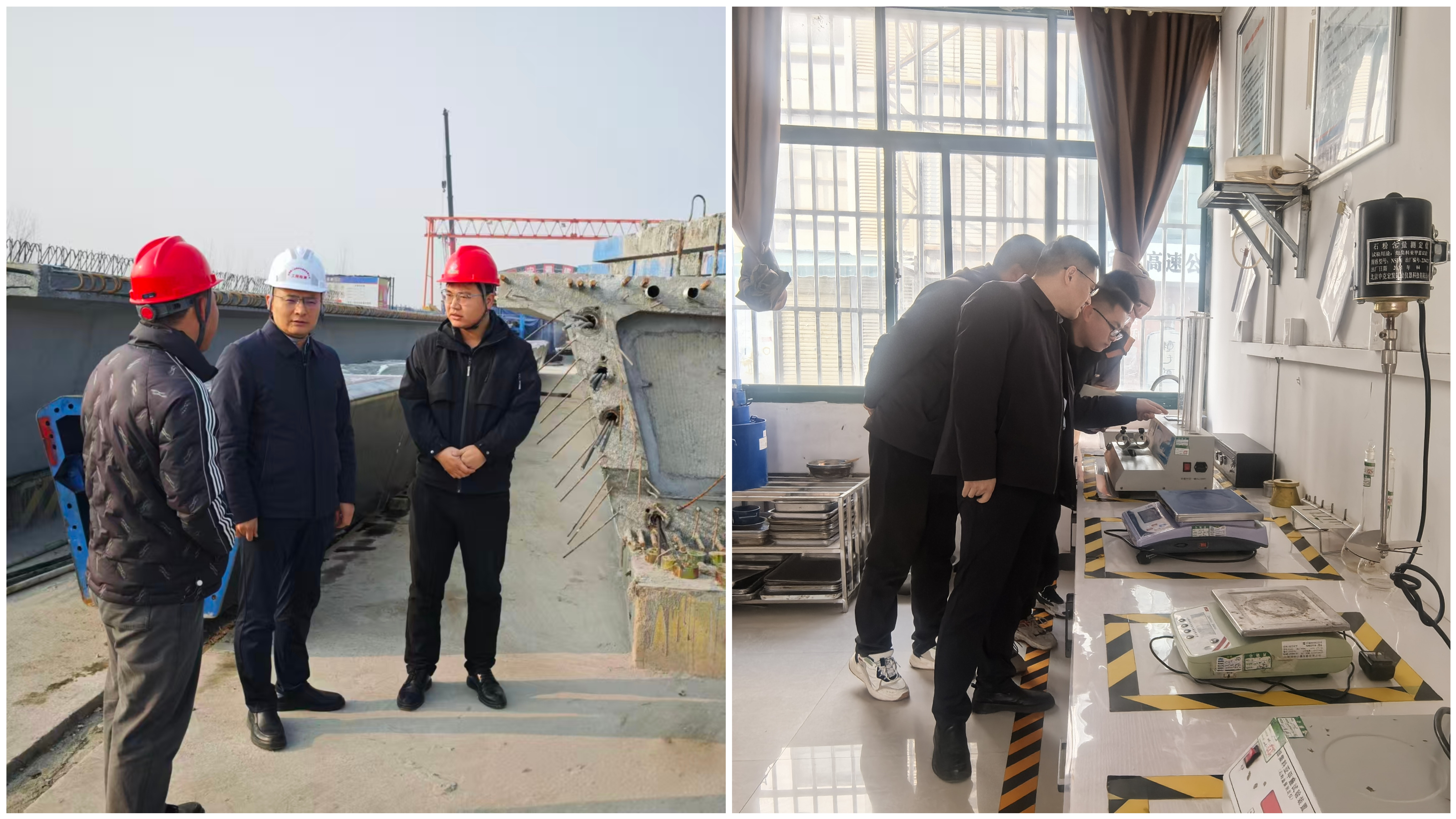 葛道文一行先后深入S20长固高速预制梁场、城东湖特大桥施工现场及工地试验室,实地查看检测工作进展,详细了解质量体系运行与安全制度执行情况。