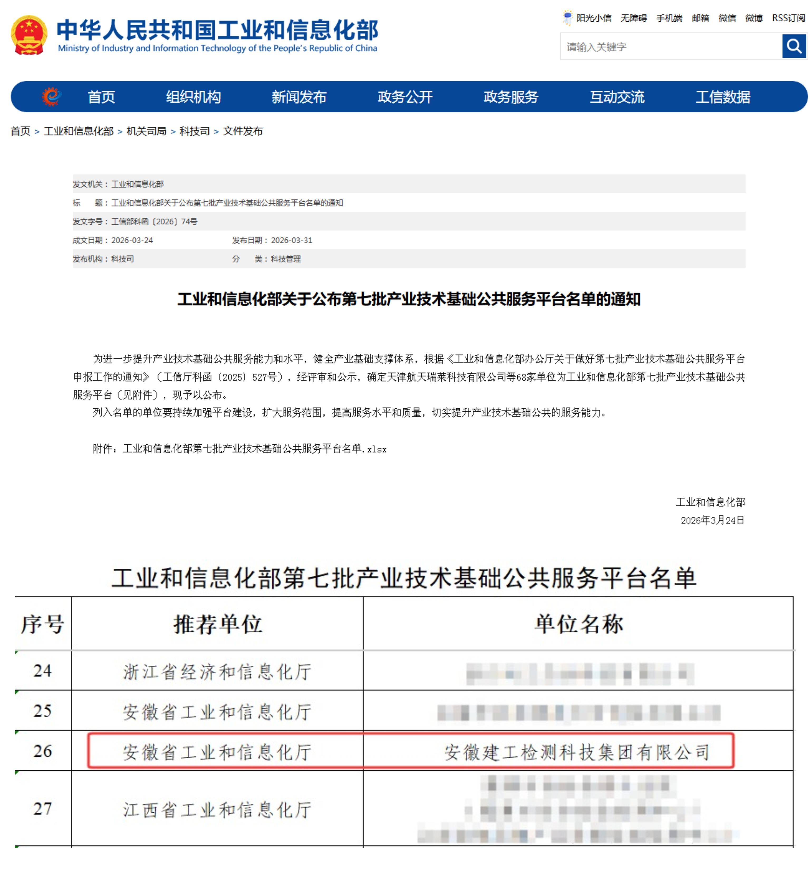 近日,工业和信息化部正式公布第七批产业技术基础公共服务平台名单,建工检测成功登榜,标志着公司的技术实力、公共服务能力与行业影响力获得国家层面的权威认可。