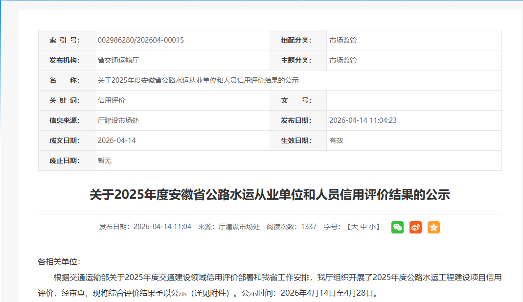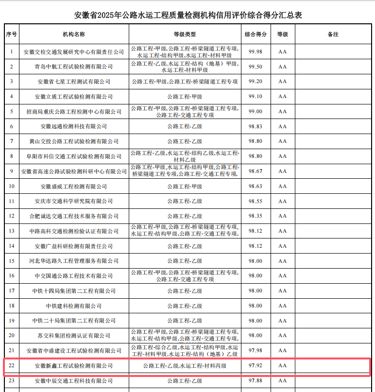 近日,安徽省交通运输厅公布了2025年度公路水运工程试验检测机构信用评价结果。安徽新鑫工程试验检测有限公司凭借规范的经营管理、过硬的技术实力及良好的诚信履约表现,综合评分达97.92分,成功获评AA级信用等级。
