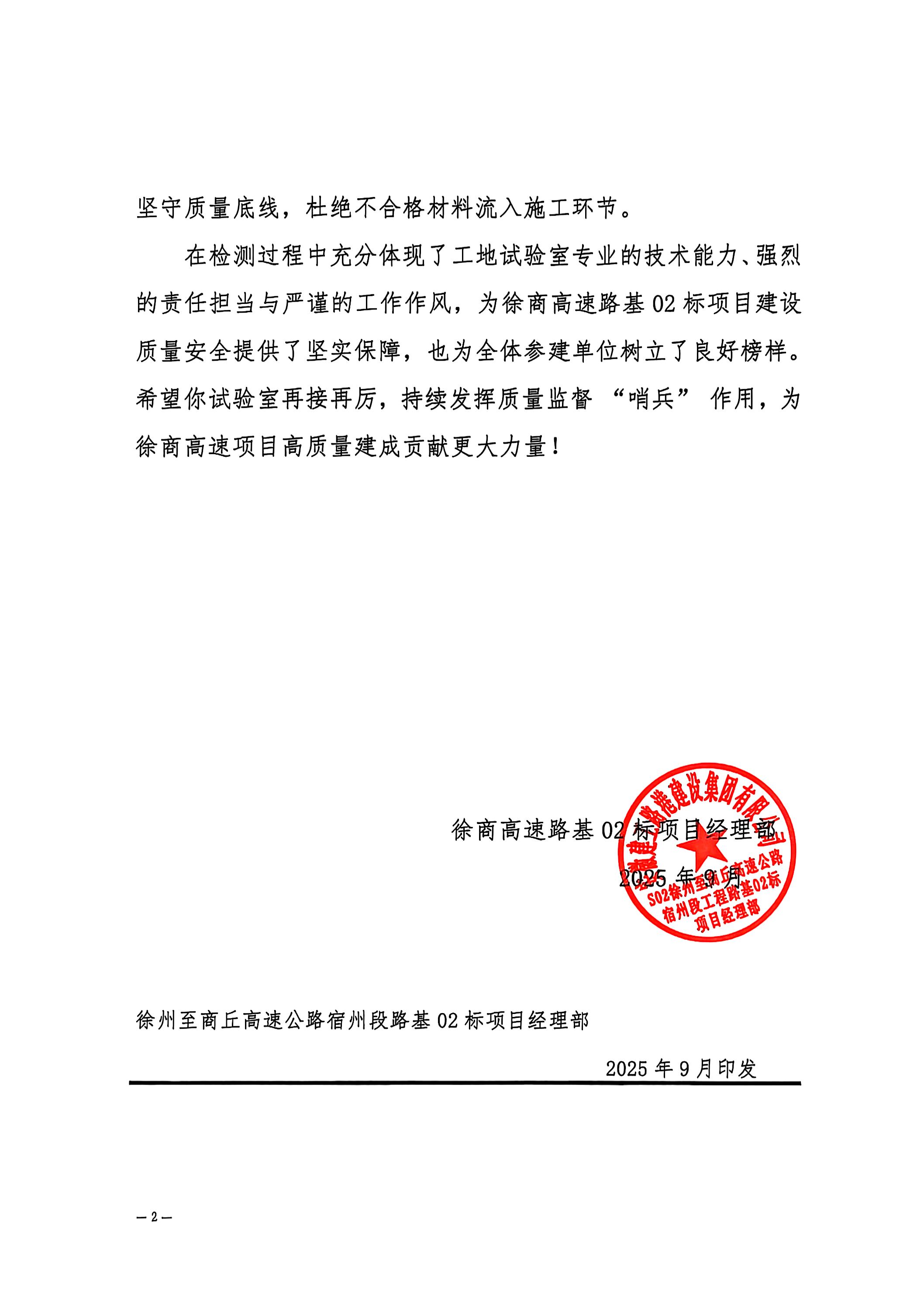 近日,S02徐商高速路基02标项目试验室收到表扬信,信中对其在项目建设过程中严格把控质量,切实保障项目建设进度和质量安全方面的突出表现进行通报表彰。