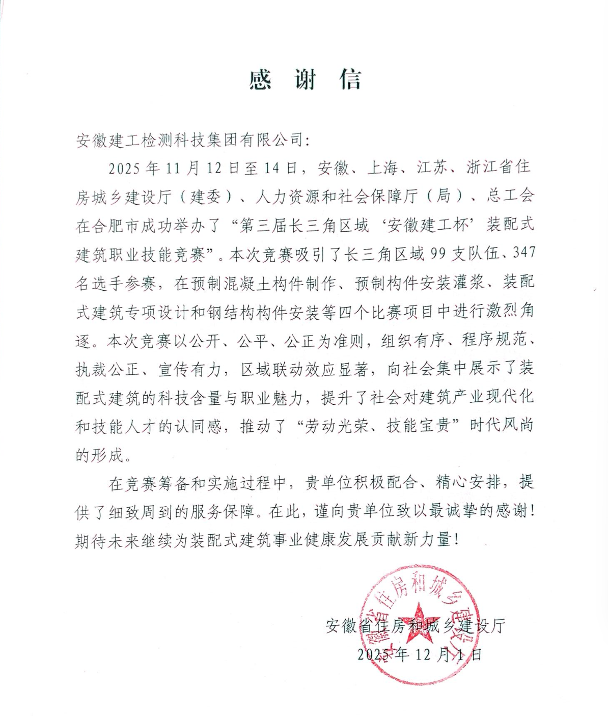 近日,公司收到安徽省住房与城乡建设厅感谢信,对公司服务保障“第三届长三角区域‘安徽建工杯’装配式建筑职业技能大赛”作出的积极贡献表示感谢。