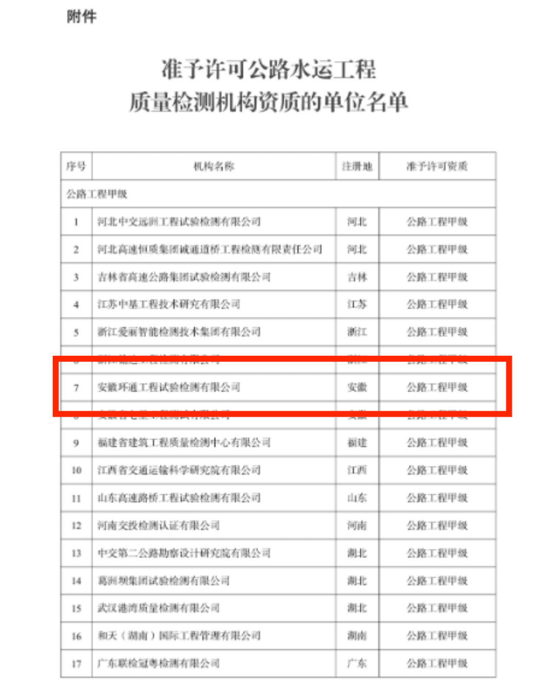近日,交通运输部公布准予许可公路水运工程质量检测机构资质的单位名单,环通检测顺利通过公路工程甲级资质复评审,继续保有该领域最高等级检测资质。