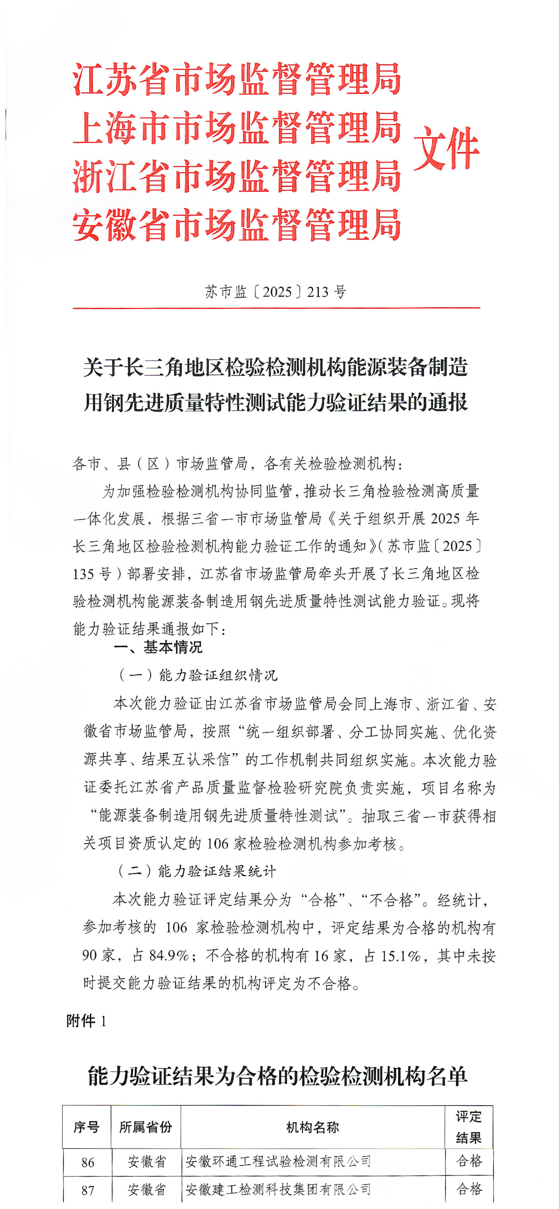 近日,长三角三省一市市场监督管理局、安徽省市场监督管理局先后通报了2025年度检验检测机构能力验证结果。建工检测公司本部、淮南分场所及所属环通检测、建昌检测在上述各项能力验证中结果均为“合格”。