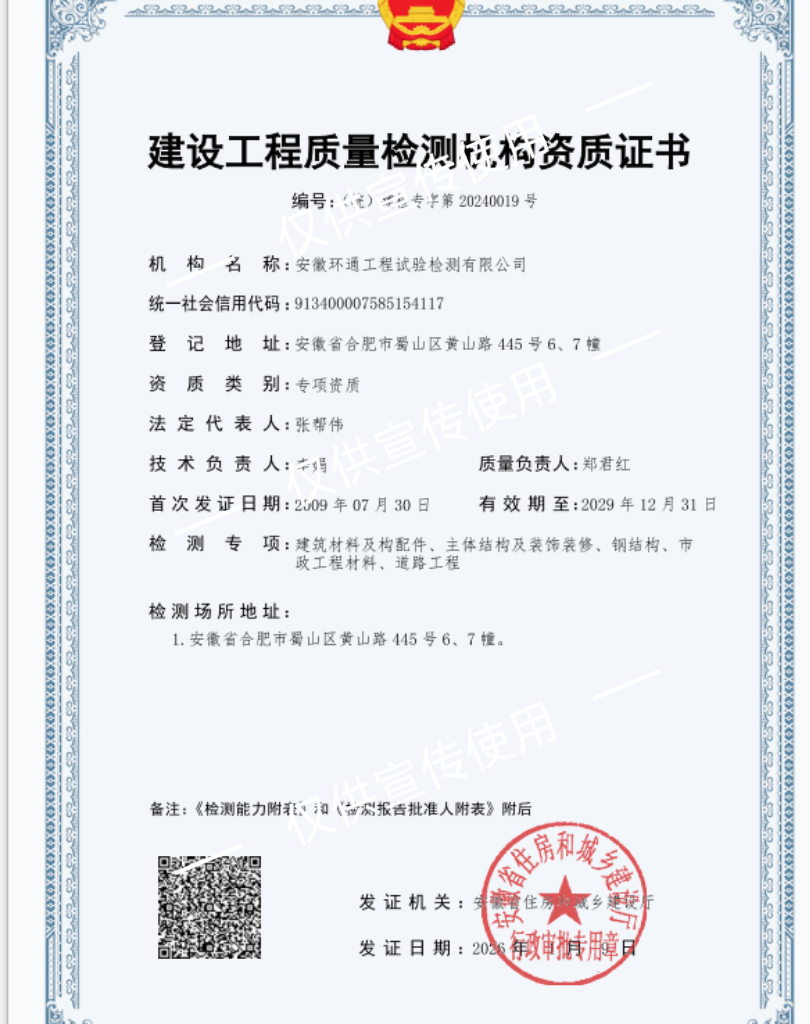 近日,环通检测顺利取得主体结构及装饰装修、钢结构、道路工程3个建设工程专项检测资质增项,资质实力再获提升。目前,环通检测已拥有5个建设工程专项检测资质,检测服务范围进一步拓宽,核心竞争力持续增强。